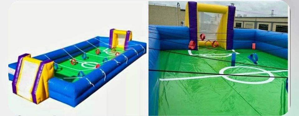 ‘Human Foosball’ is a unique experience for your outdoor event. The arena resembles an inflatable soccer field, but this is not soccer…this is foosball! With it’s gigantic inflatable walls to its soft, team-coloured harnesses, the Human Foosball inflatable takes two teams of five head on for a grueling game of soccer with a twist – every player is strapped in a bungee line. This equals hilarious results that takes dedication and plenty of communication to score a goal. Area Required 7x12m Available for backyard party's for $450.00 delivered for 4 hours. Public events, Supervised hire is from $700.00 for 3 hours fully supervised/operated.