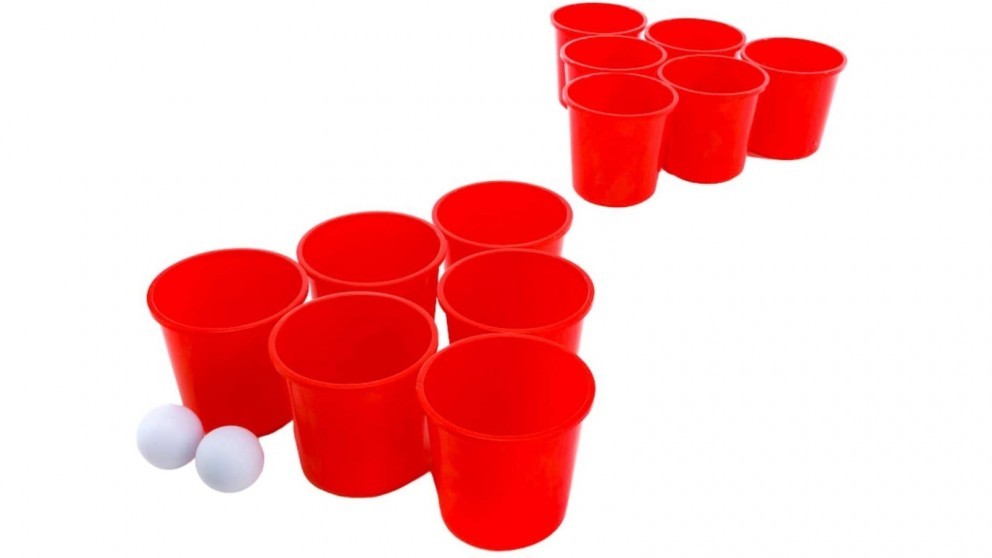 Jumbo Version of Beer pong, Sink the Balls into the Bucket, comes with 13 Buckets, Balls are Included. You don't need to play with beer to make this game fun. Line 6 buckets up in a triangle formation, a distance apart opposite another 6 buckets and aim to throw your ball to land in a bucket. From $50.00